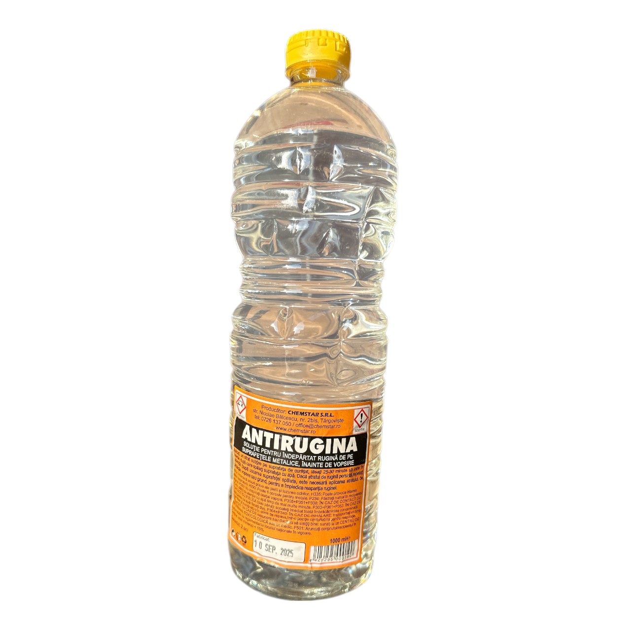 Instructiuni de utilizare: Se aplica un strat subtire pe suprafata care trebuie curatata de rugina si se lasa 25-30 minute pentru ca solutia sa isi faca efectul dorit, dupa care se spala suprafata cu apa, daca stratul de rugina persista, se repeta operatiunea.