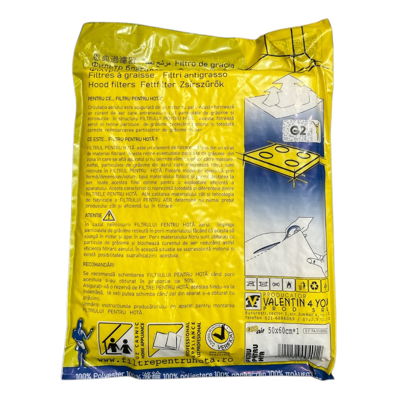 Filtrul de hota universal cu dimensiunea de 50x60 cm este un element de filtrare pentru hote, compus dintr-un strat de material filtrant capabil sa retina particulele de grasime sau fum greu, pentru a proteja motorul hotei. In acest fel ii veti prelungi durata de functionare. Filtrul de hota universal este un "consumabil" care necesita inlocuire periodica (schimbarea se face dupa ce porii devin opturati in proportie de 40-50%) din cauza grazimii, murdariei sau fumului. Filtrul universal de hota are o dimensiune de 50 cm x 60 cm si poate taiat sau decupat in functie de dimensiunea compartimentului hotei. Filtrul de grasime hota universal nu poate fi reutilizat chiar daca il spalati in mod repetat. Compatibil cu majoritatea hotelor.