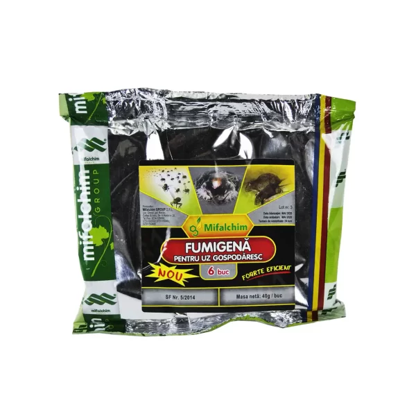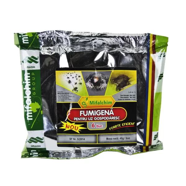Fumigene cartite, plosnite, insecte 6 bucati este un produs sub forma de cartuse pe baza de sulf pentru uz gospodaresc. Fumigenele pentru cartite, plosnite, insecte sunt realizate din sulf pulbere pe suport de carton. Aceste fumigene de cartite, plosnite si insecte cu forma cilindrica se pot folosi in multiple situatii. Fie ca vreti sa scapati de mucegaiul din spatiile cu umiditate ridicata sau sa indepartati rozatoarele si insectele zburatoare, fumigenele cu sufl sunt foarte eficiente. Prin arderea mineralului se degaja un fum inecacios, ce are rolul de a diminua oxigenul ce creeaza efectul de fermentatie. Fumul degajat, bogat in dioxid de sulf (SO2) inlatura tantarii si musculitele de otet din depozitele de legume si fructe. Fumigenele anti insecte reduc fermentatia legumelor, fructelor si cerealelor din depozite, incoltirea legumelor, precum si migrarea cartitelor, soarecilor, a rozatoarelor. In plus, acest produs se poate utiliza si ca fumigena insecticid.