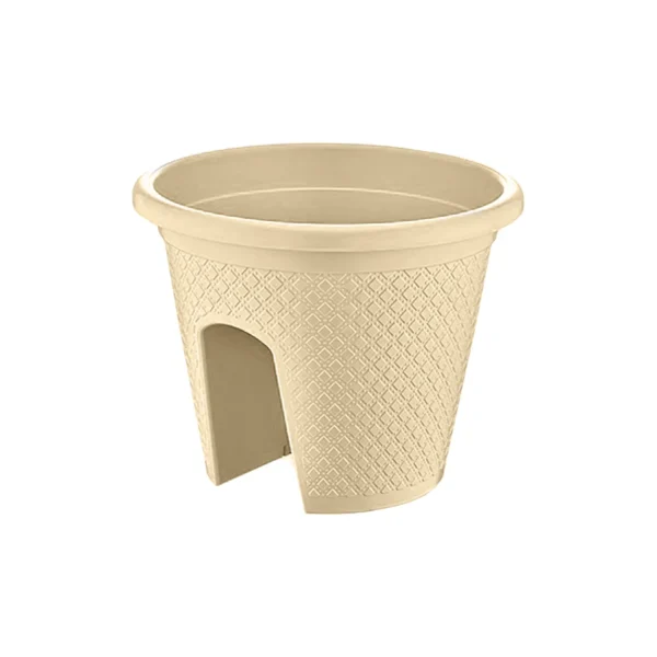 Ghiveciul de balustrata sau balcon din plastic cu volumul interior de 6.8 litri de culoare crem este un produs creat special pentru amplasarea sa directa pe o balustrada sau margine de balcon, datorita formei sale inedite. Acesta este fabricat din polipropilena dura dar flexibila, extrem de rezistenta atat la lovituri involuntare cat si la ploaie, vand sau raze solare UV, fiind excelent si pentru spatiile exterioare. Totodata, ghiveciul din plastic de balustrada este placut modelat pe exterior cu romburi iesite in relief, oferind un aspect de invidiat alaturi de florile dumneavoastra.