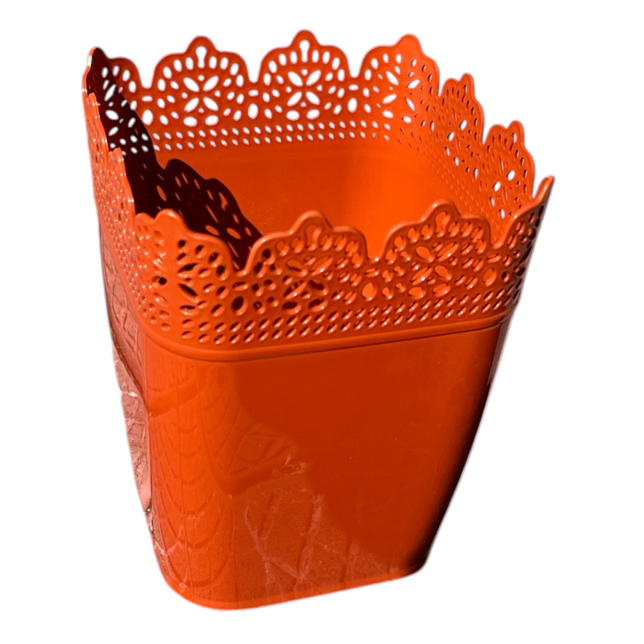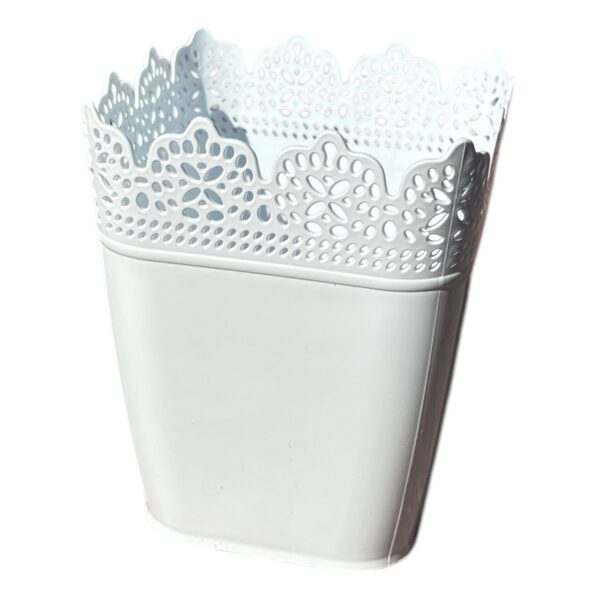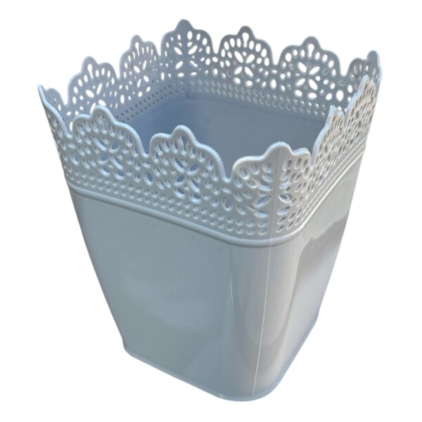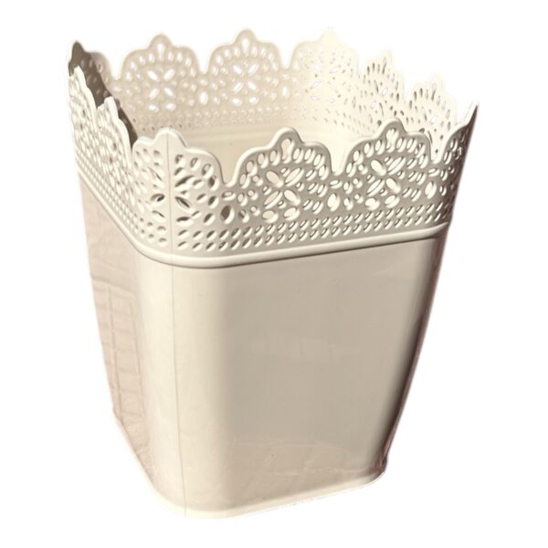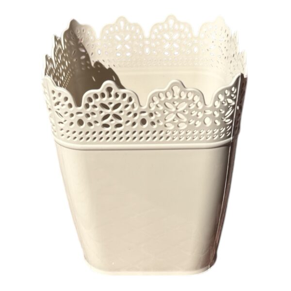 Ghiveciul din plastic cu forma patrata si design dantelat va ofera un element de frumusete si rafinament in orice spatiu. Culoarile sale, se integreaza cu usurinta in decorul floral si poate fi o piesa atractiva in gradina, pe terasa sau in interiorul casei. Ghiveciul dantelat este confectionat din plastic durabil si rezistent la intemperii, socuri sau modificari atmosferice. Acest lucru il face potrivit pentru utilizareea sa in exteriorul casei cat si in spatiile interioare (dupa preferinte). Ghiveciul de plastic dantelat are forma patrata, asigurand un spatiu suficient pentru flori si diferite plante decorative. Marginile superioare dantelate adauga un detaliu decorativ frumos si ofera un aspect sofisticat ghiveciului.