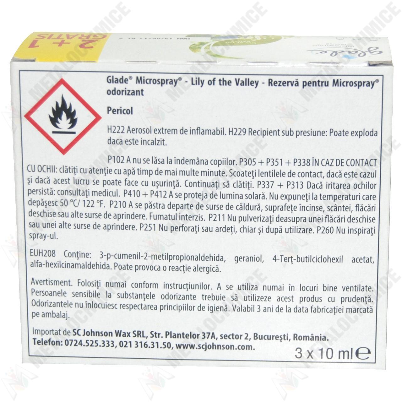 Odorizantul de camera 2 plus 1 gratis de Glade Microspray cu aroma Lilly of the Valley si in cantitate de 10 ml per rezerva, reprezinta cea mai usoara si practica metoda de eliminare a mirosurilor neplacute in timp ce le inlocuieste cu un miros proaspat de lacrimioare. Rezervele de odorizant functioneaza doar cu aparatul aferent lor (Glade sense and touch sau Microspray) si se poate depozita impreuna cu aparatul oriunde in casa eliberand o prospetime nemaivazuta. Atentie! Aerosol extrem de inflamabil.