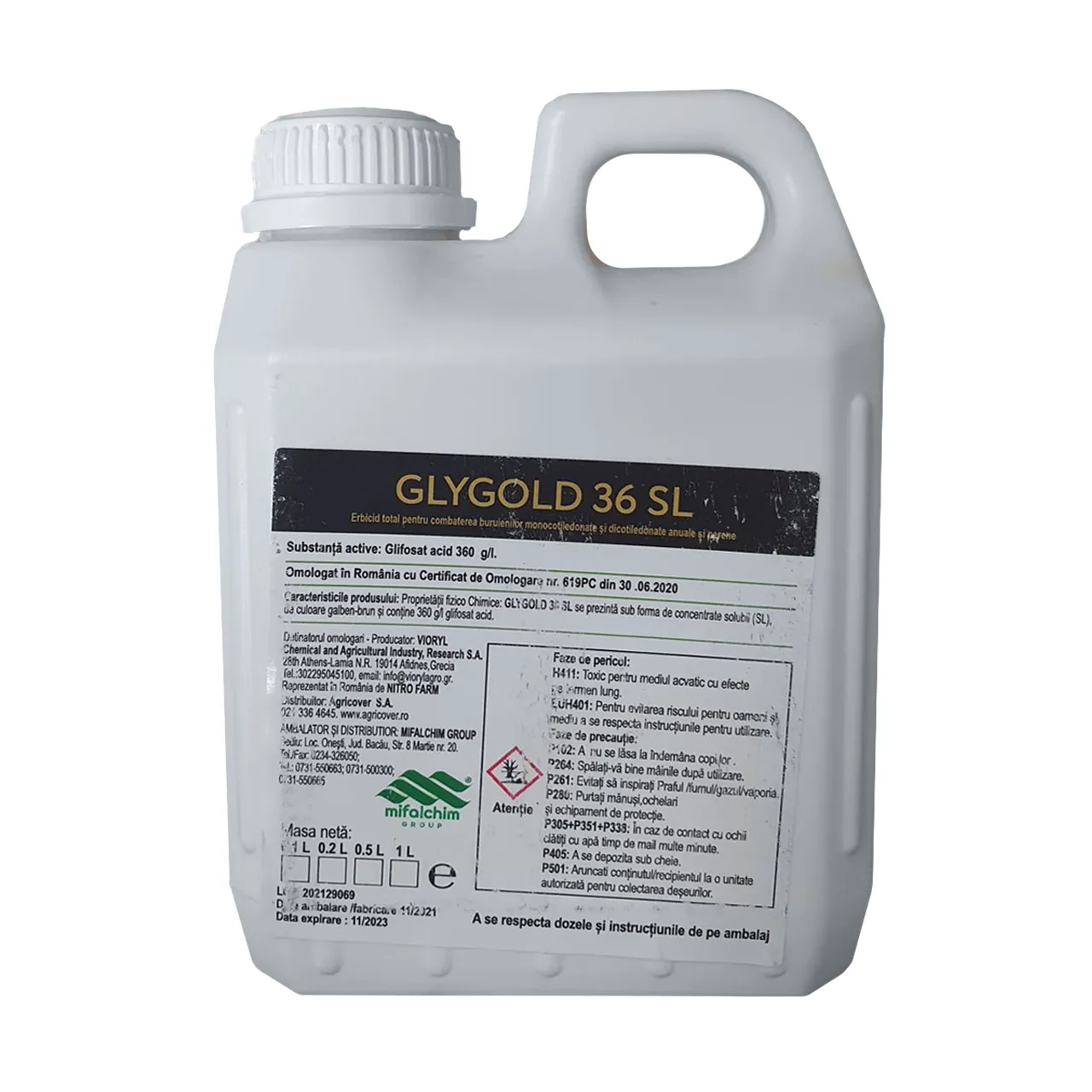 GLYGOLD 36 SL este un erbicid total eficient pentru buruieni monocotiledonate si dicotiledonate anuale si perene, inclusiv Urtica sp Malva sp., Polygonum sp., Portulaca oleracea (grasita), Pir gros (Cynodon dactylon), ferigi (Pteridium sp.), Volbura (Convolvulus arvensis), rogozuri (Piulita de iarba - Cyperus rotundus, Ciufa - Cyperus esculentus, Cyperus sp.). Este un produs omologat pentru utilizarea sa in livezile semintoase, livezi de samburoase, vita de vie, terenuri dupa recoltare si terenuri cu viitoare culturi agricole.
