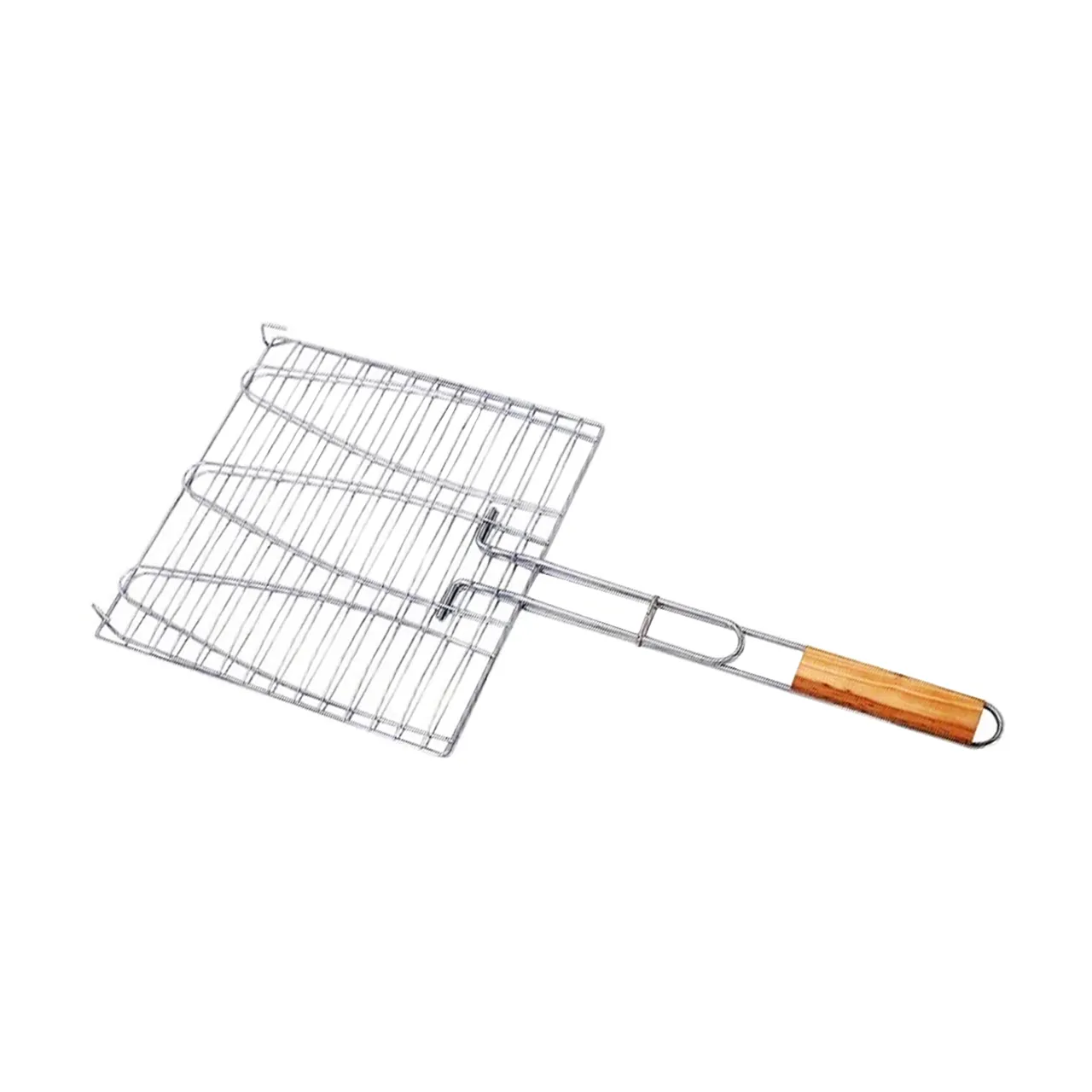 Gratarul dublu pentru peste si friptura, cu dimensiunile de 28 x 28 cm, este fabricat din otel cromat si poate fi utilizat direct pe jarul incins sau in soba, fiind ideal pentru gospodarie sau pentru excursiile in camping. Mai mult decat atat, dispune de coada lunga cu maner din lemn, oferindu-va control si usurinta in manevrare in timpul procesului de gatire. Gratarul de peste si friptura este rezistent la temperaturi inalte, socuri mecanice moderate si murdarie. De asmenea, poate fi spalat cu orice fel de detergent pentru vase.