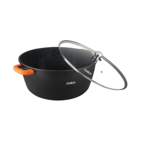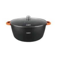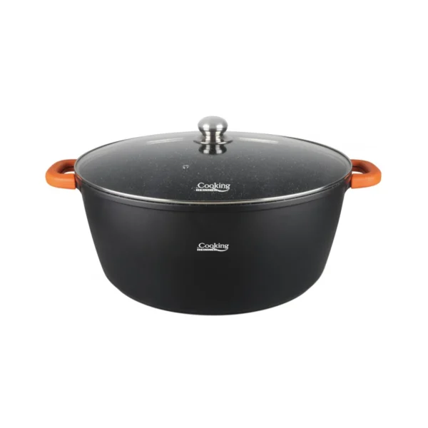 Semioala din aluminiu turnat cu capac de 23 de litri, din gama Dark Line de la Heinner, este excelenta pentru prepararea unei game variate de mancaruri, atat solide cat si lichide, in cantitati mari. Cu un interior acoperit cu un strat de ceramica neagra marmorizata, aceasta Semioala asigura o suprafata nonstick, iar manerele de pe laterale sunt acoperite cu un strat gros de silicon termorezistent care impiedica aparitia transferului termic. Volumul impresionant de 23 de litri o face ideala pentru gatirea unei cantitati foarte mari de mancare solida sau supe si ciorbe, fiind perfecta pentru evenimente, restaurante sau cantine. Capacul din sticla termorezistenta este complet transparent si dispune de un orificiu pentru eliberarea rapida a presiunii formate in interior si a aburilor. Mai mult decat atat, este compatibila cu toate tipurile de plite, inclusiv cele pe inductie, pe gaz sau electrice.