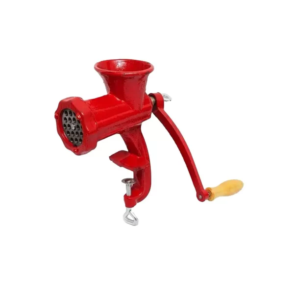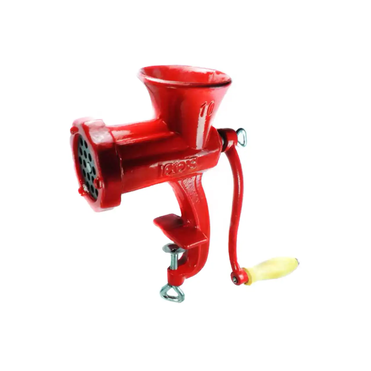 Maşină de tocat carne manuala nr 10 de la ICOS este unul dintre cele mai mari ajutoare in bucatarie, pentru tocarea tuturor tipurilor de carne atunci cand preparati o variatete larga de mancaruri traditionale cat si pentru umplerea matelor pentru carnati, putand inlocui cu succes carnatarul. Masina de tocat carne ICOS este fabricata in totalitate din fonta si vine prevazuta cu maneta cu maner din lemn, sita si cutit de tocat. Masina de tocat carne se poate fixa rapid de marginea meselor sau blaturilor, astfel incat sa lucrati foarte usor si rapid. Maşina de tocat carne manuala este acoperita pe intreaga suprafata cu un strat de vopsea de culoare rosie ce protejeaza fonta de rugina si asigura un aspect placut masinii de tocat.