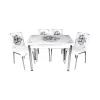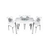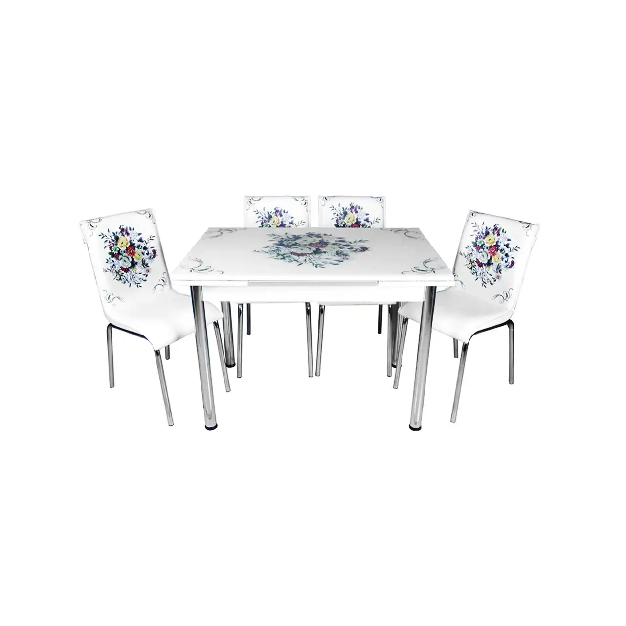Masa extensibila pentru bucatarie cu 4 scaune este fabricata dintr-un blat de MDF pe care vine un strat de 4 mm de sticla securizata. Picioarele care sustin blatul cu sticla, sunt obtinute din metal lucios (cromat), au forma cilindrica, iar la baza lor au protectie din plastic pentru evitarea zgarierii suprafetelor. Scaunele ofera un confort sporit datorita buretelui din interior, cat si pielii ecologice de pe exterior. De asemenea, structura scaunelor este tot din metal cilindric cromat. Culoarea dominanta al acestui set de masa extensibila cu 4 scaune este albul, iar fiecare piesa are imprimat un buchet de flori de primavara.