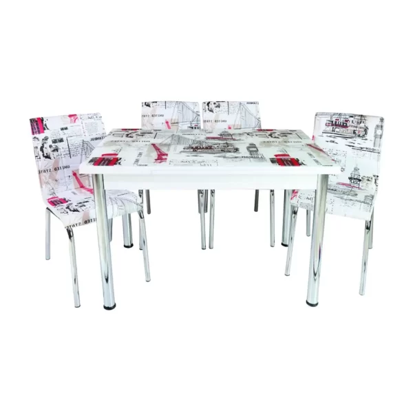 Masa living / bucatarie, extensibila din MDF si sticla cu 4 scaune