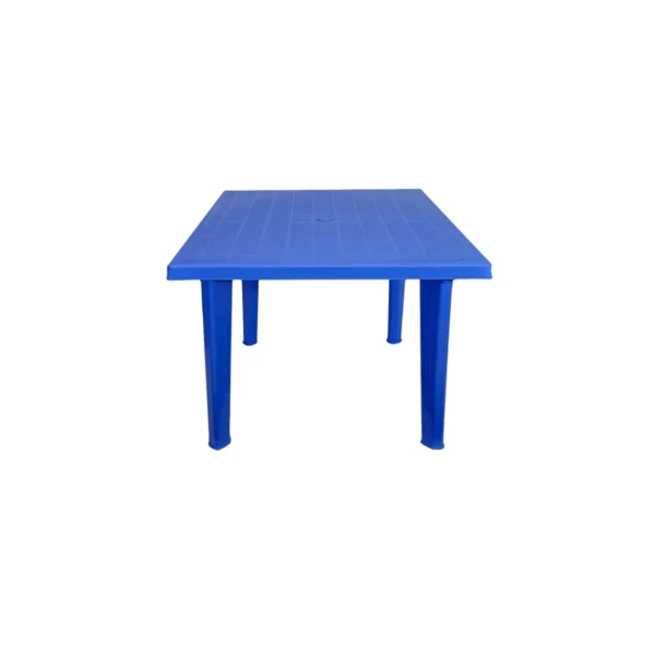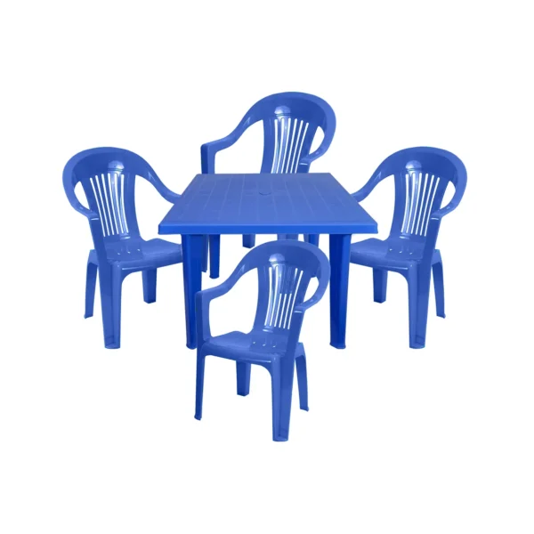 Masa de plastic, patrata dotata cu 4 scaune de culoare albastra este un set obtinut in totalitate din polipropilena ce permite utilizarea sa atat in spatii interioare cat si exterioare, precum curte, gradina, terasa, camping sau chiar si pe plaja. Masa pastrata are dimensiunile de 90x90 cm cu inaltime de 73 cm si are picioare detasabile. Scaunele au dimensiunile de 57 x 54 x 90 cm si sunt realizate din acelasi material robust si rezistent imporiva ploilor, decolorarii generate in timp din cauza razelor solare puternice sau socurilor mecanice. In plus, Atat masa cat si scaunele din plastic sunt foarte usoare, permitand manevrarea lor cu mare usurinta.