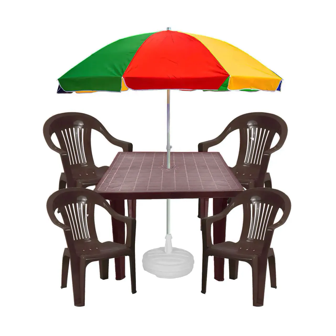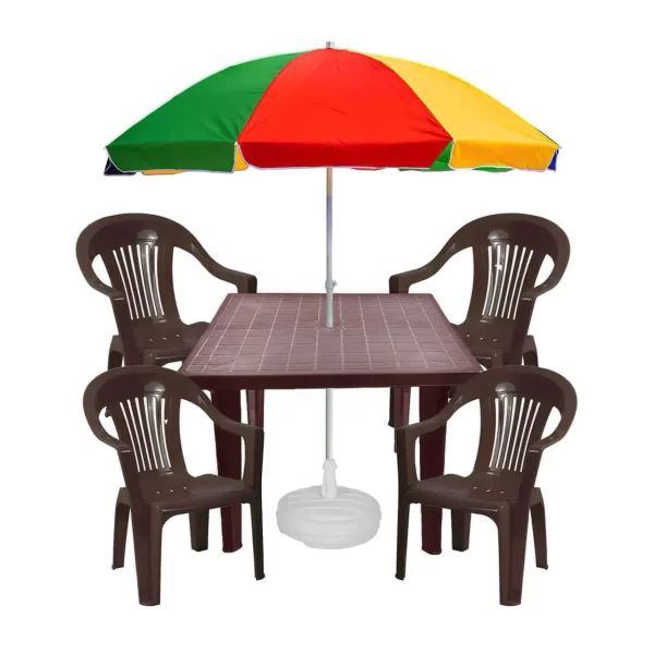 Masa plastic patrata, de culoare maro, vine impreuna cu 4 scaune si o umbrela solara. Aceasta masa si setul de 4 scaune sunt fabricate din plastic polipropilena durabila, potrivita pentru utilizarea in aer liber. Masa are blat in forma patrata si ofera suficient spatiu pentru acomodarea a patru (4) persoane. Este usor de curatat si rezistenta la factorii externi, precum soarele, ploaia, schimbarile de temperatura sau umezeala.