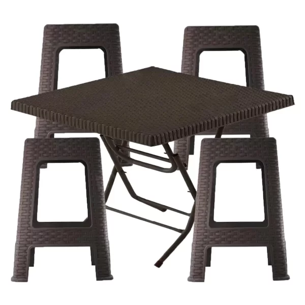 Masa plastic pliabila cu 4 scaune imitatie ratan de culoare maro sunt fabricate din plastic dur, ce are utilizare multipla. Acest set se va incadra perfect in orice decor de apartament, gradina, terasa sau foisor. In plus, atat masa pliabila (plianta), cat si cele 4 scaune plastic va pot insoti in vacantele cu cortul sau rulota.