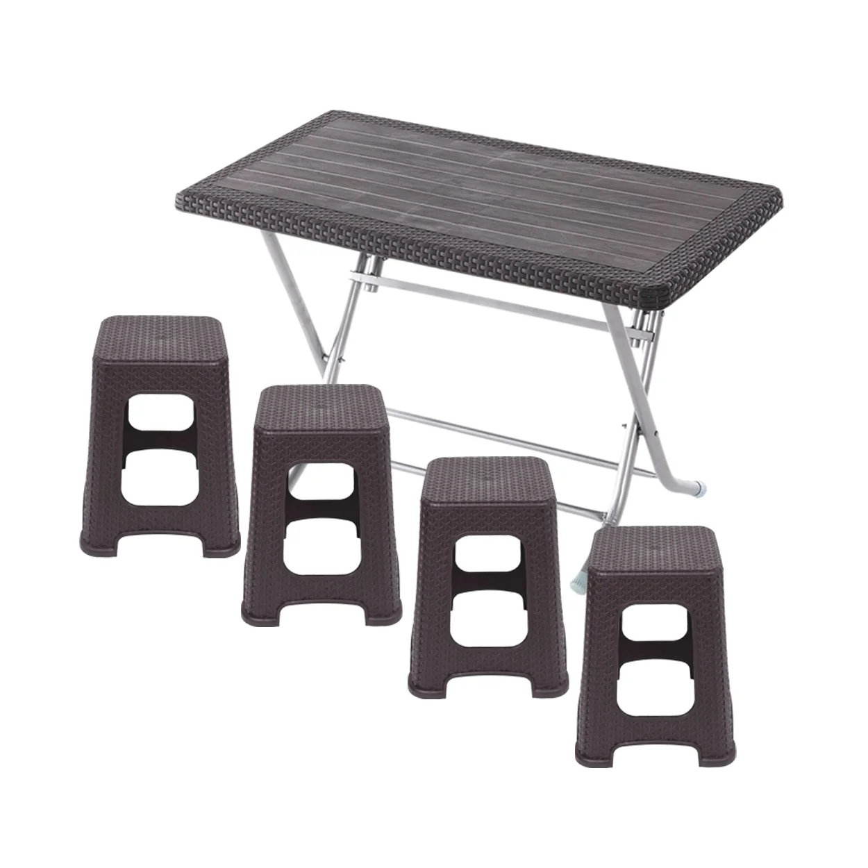 Masa pliabila cu picioare otel si 4 tabureti plastic ratan maro