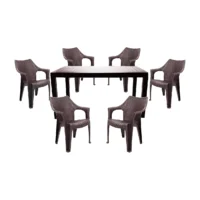 Masa de gradina si terasa din plastic cu 6 scaune ce imita ratanul impletit ofera un aspect modern cu elemente clasice oricarui spatiu exterior. Totodata, curatarea / spalarea setului se poate face cu aun prosop / laveta umeda sau uscata.