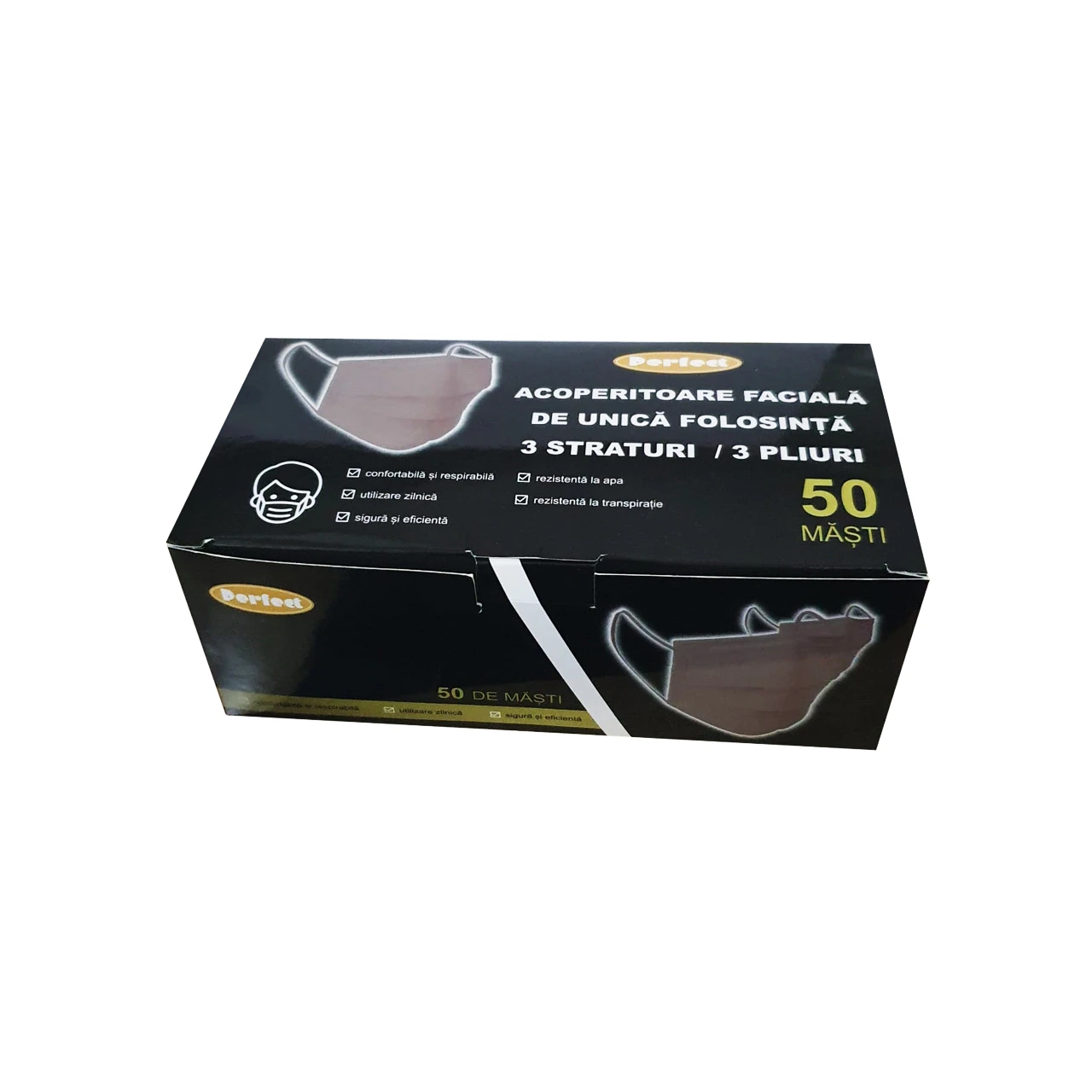 Mastile de protectie negre cu 3 straturi ambalate la cutie de 50 bucati sunt de unica folosinta si se utilizeaza pentru acoperirea faciala a gurii, nasului si barbiei, Mastile negre de protectie sunt alcatuite din 3 straturi de material netesut cu PP au 3 pliuri, rezista la apa, transpiratie si variatii de temperatura (rece-cald). Mai mult decat atat, acestea sunt foaste confortabile, nu creaza dificultati de respiratie, va protejeaza de praf, particule daunatoare si nu se vor deteriora usor. Mastile de protectie negre de unica folosinta sunt ideale in momentele in care intrati intr-un spatiu comercial sau va aflati in locuri aglomerate (in autobuz / metrou, etc).