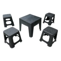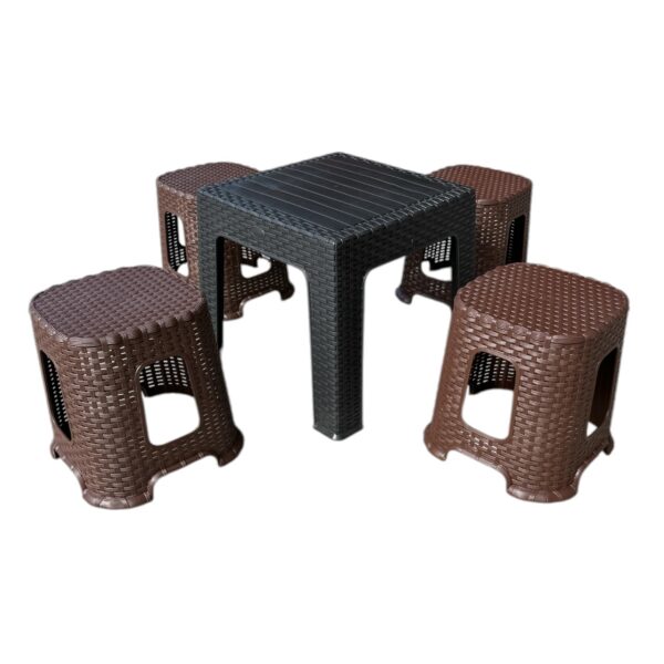 Masuta cafea plastic ratan cu 4 tabureti mici, maro