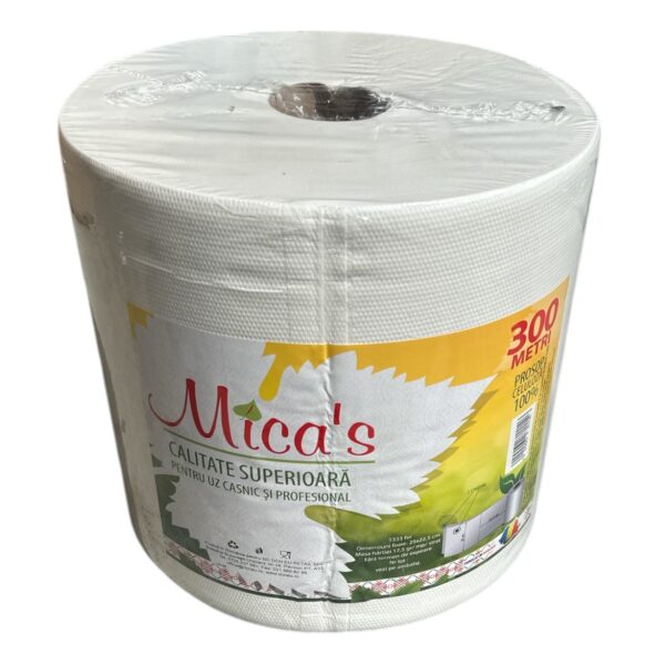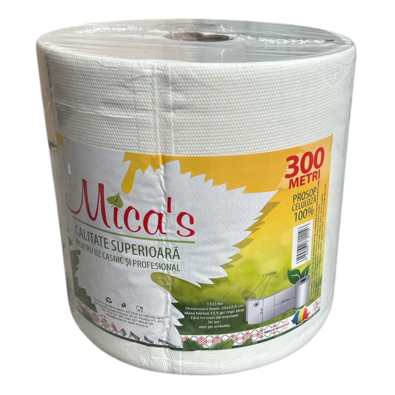 Prosopul de hartie 2 straturi marca Micas la rola de 300 m, este realizata din celuloza pura si vine pretaiata in portiuni de 25 x 22 cm. Prosopul este ideal pentru utilizarea sa in bucatarie, in baie dar si in alte spatii, precum cele comerciale si activitati de curatenie intrucat este puternic absorbant al lichidelor, va puteti sterge pe maini, veti putea curata orice suprafata neteda sau elimina excesul de ulei de pe alimente. Mai mult decat atat, este foarte rezistenta si nu se rupe / destrama in timpul utilizarii.