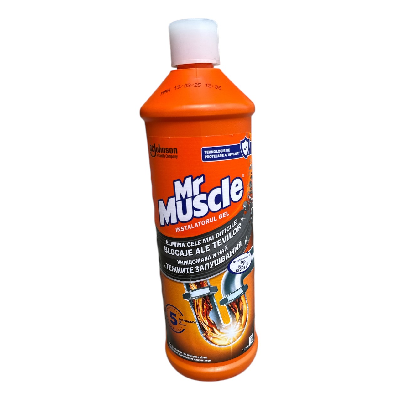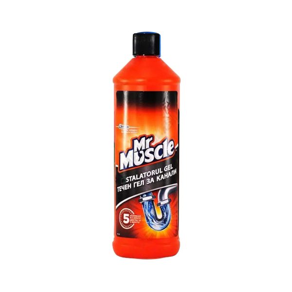 Mr. Muscle sub forma de gel pentru desfundarea tevilor din baie si bucatarie cu o cantitate de 1000ml este o solutie tip gel hidraulic foarte vascoas ce actioneaza rapid, inlaturand dopurile formate in tevile de scurgere din baie cat si din bucatarie, fara sa le atace. In cazul in care chiuveta dumneavoastra a ramas infundata de catre resturile de mancare si grasime, desfundarea ei intr-un mod clasic necesita foarte mult timp. Mr. Muscle instalatorul gel desfunda cu rapiditate orice instalatie infundata in doar 15 minute de la utilizarea acestuia fara nevoia de o pompa pentru desfundat tevi. Mr Muscle gel folosit impreuna cu apa calda va dizolva rapid obstacolul aflat in scurgere indiferent de tipul sau cantitatea sa si pastreaza tevile curate o lunga perioada de timp.