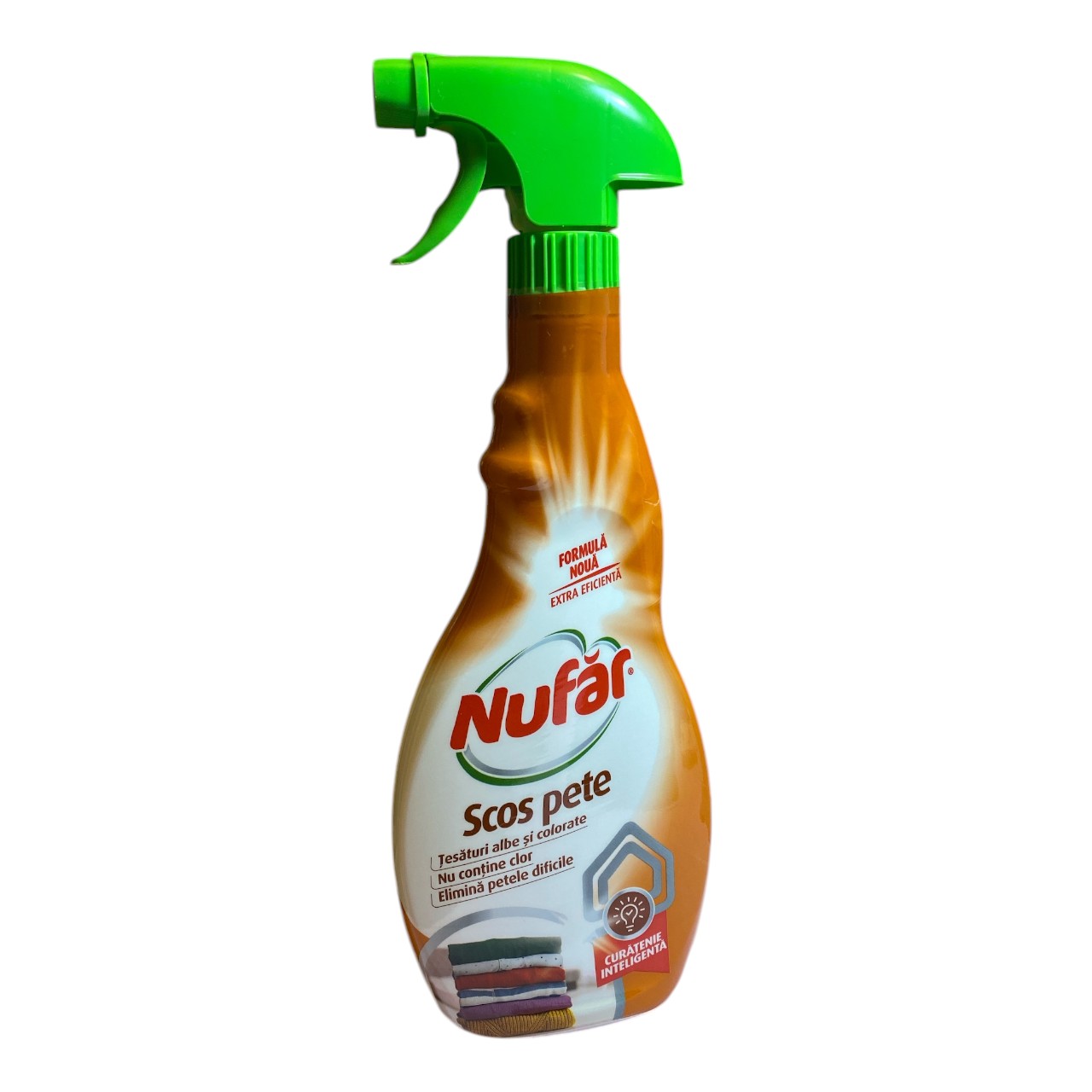 Nufar pete la 500 ml este o solutie cu pulverizator ce a fost creata special pentru a elimina chiar si cele mai dificile pete de pe tesaturile atat albe, cat si colorate. Multumita formulei sale active, Nufar pentru scos pete va indeparta murdaria persistenta de pe orice tip de material textil fie ca este vorba de draperii, canapele, covoare, tapiterii, perdele sau chiar si haine. Petele de motorina, ulei, vaselina, alimente, machiaj, transpiratie, carioca, ce v-au dat batai de cap mult timp, acum vor fi de domeniul trecului multumita acestei solutii. Datorita faptului ca solutia pentru scos pete nu contine clor, acest produs nu deterioreaza tesaturile, iar culorile vor fi vii si naturale.