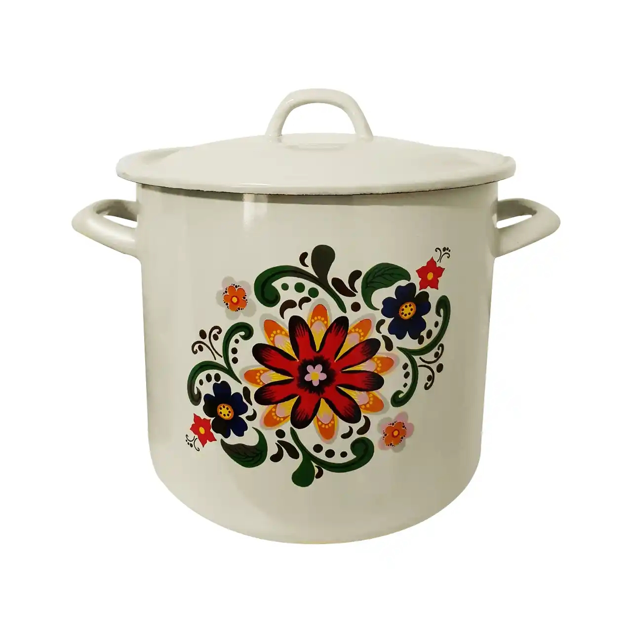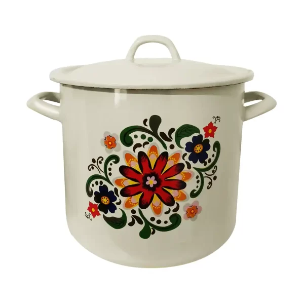 Oala emailata de 8 litri dotata cu capac este fabricata prin vitrificarea prafului de sticla pe suprafata otelului carbonat, ce are loc intr-un cuptor electric special pentru a uniformiza emailul prin arderea controlata sub temperaturi cuprinse intre 800 - 900 °C. Oala emailata de 8L dobandeste un aspect lucios, neted, care apara otelul de rugina, de acizi alimentari, este impermeabil (nu permite apa sa patrunda), anticoroziv, mareste durata de viata a oalei si nu in ultimul rand, este antibacterian. Oala are o capacitate de 8 litri si este accesoriul cel mai potritiv pentru iubitorii de gatit, fie ca acest lucru se intampla pe aragaz, plita, sau pe focul de camping. De asemenea, oala este prevazuta cu capac fabricat in acelasi mod.