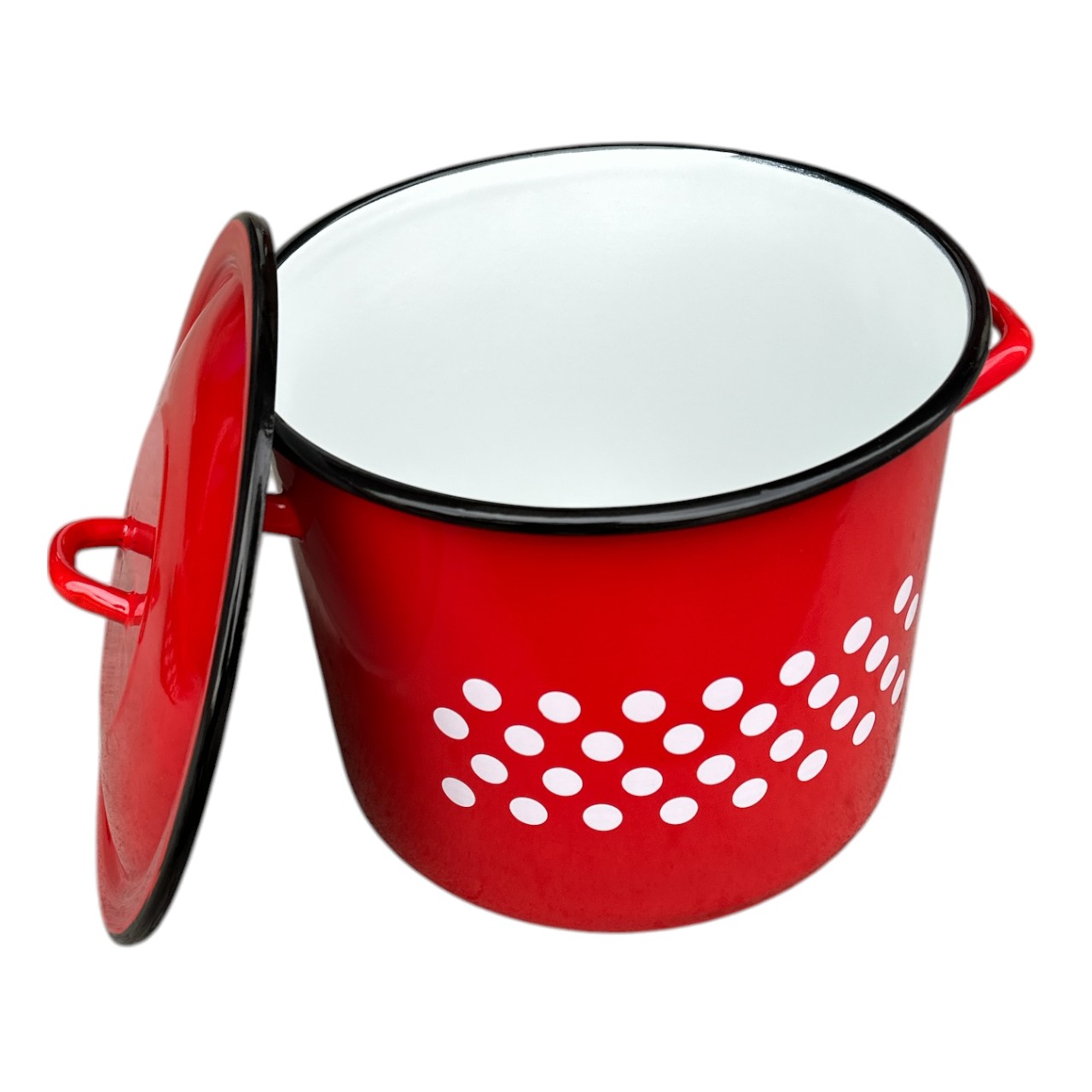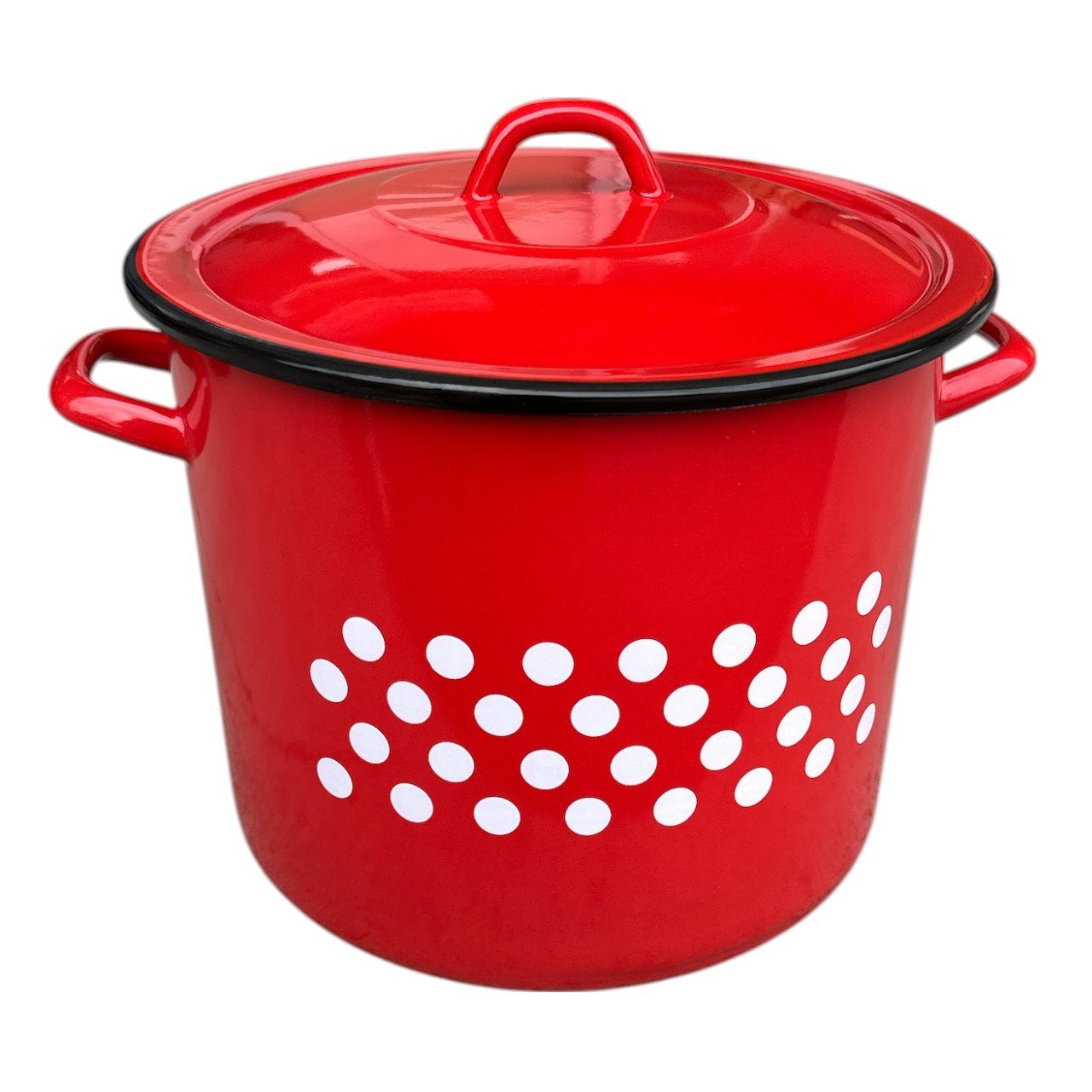 Oala profesionala emailata cu capac si model cu buline si un volum de 15 litri reprezinta un recipient pentru gatit, indispensabil si detinut de majoritatea gospodarilor. Acesta este construit din otel foarte dur, rezistent socurilor mecanice. Este in totalitate invelit intr-un smalt cunoscut ca si "email" si are proprietate antibacteriana si este rezistenta zgarieturilor si ciobiturilor. Vine impreuna cu un capac confectionat din acelasi material pentru acoperirea recipientului. 2 manere laterale vin in ajutorul manevrarii recipientului cat mai usor si sigur.