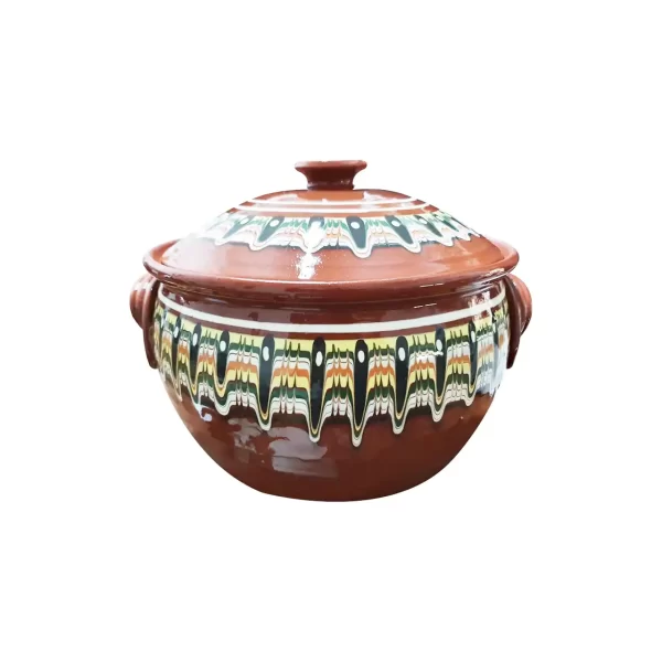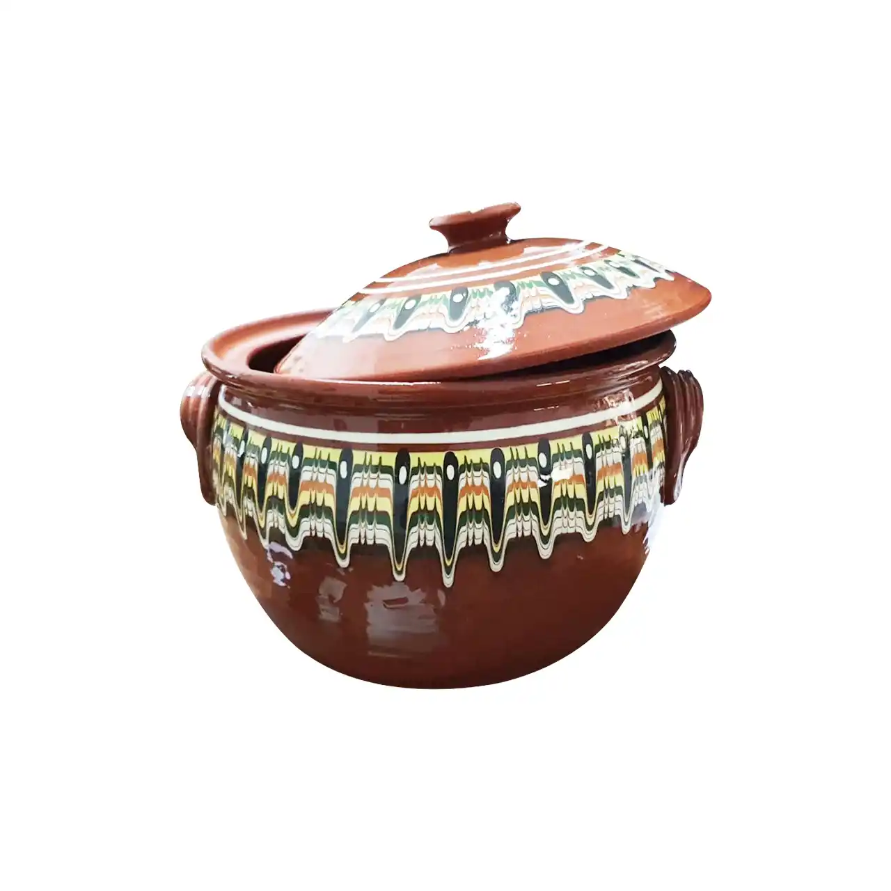 Oala din lut pentru sarmale cu capac, volum de 6 litri si culoare maro este un vas prelucrat manual, obtinut din lut (argila), prelucrat manual ce asigura un gatit in suc propriu, fara sa fie necesar adaugarea de ulei. Rezistenta sa la temperaturi foarte mare il face excelent pentru coacerea in profunzime a ingredientelor sau prepararea sarmalutelor traditionale, fripturei de pui, vita, porc, rata, tocanitei si a pitei (paine). Oala din lut de sarmale cu capac are in dotarea sa manere laterale pentru manevrarea in siguranta si are un aspect traditional, multumita culorii si desenului aplicat manual. Un astfel de vas va asigura o mancare mult mai gustoasa, care isi va pastra mai mult timp nutrientii si aroma.