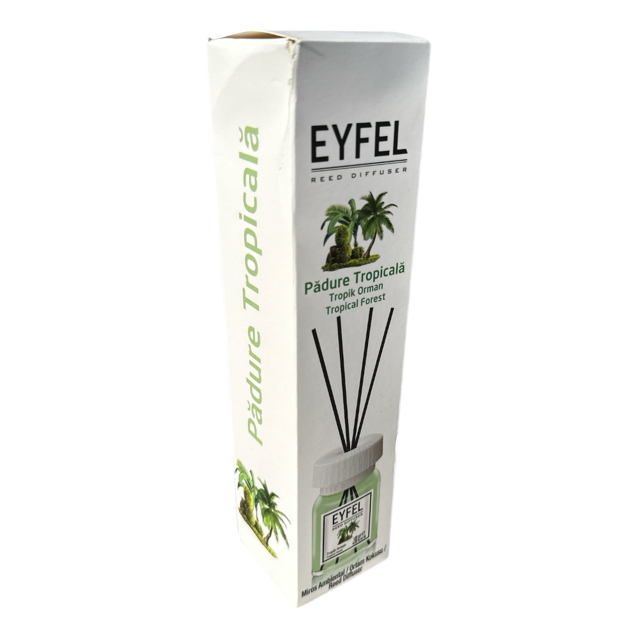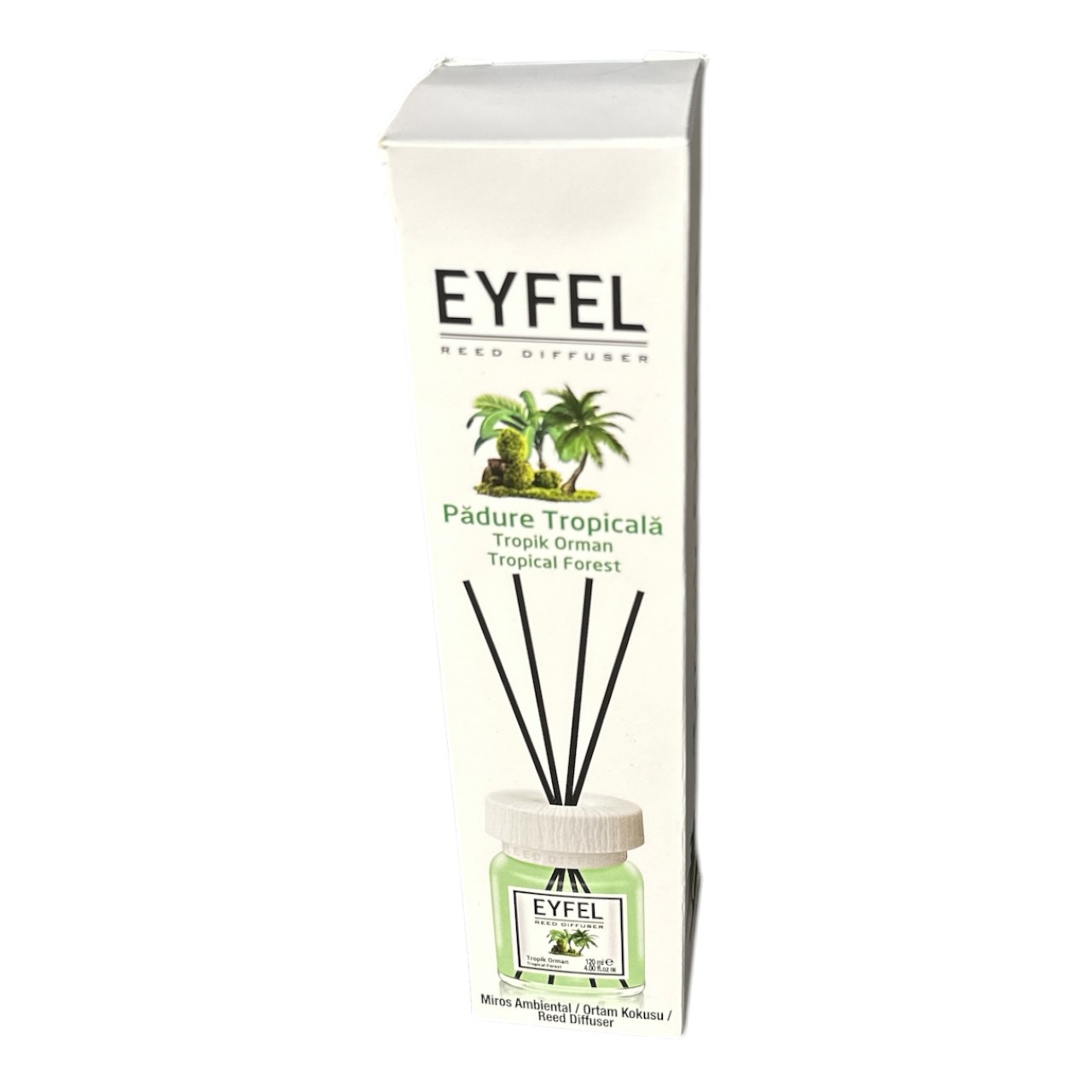 Odorizantul de camera cu betisoare Eyfel Tropic Forest, ambalat la sticluta de 120 ml, este un parfum capabil sa ofere o atmosfera proaspata si revigoranta in propria ta casa, eliminand in acelasi timp toate mirorile nedorite, cum ar fi cel de tigara, de aer inchis sau de mancare.Aroma sa tropic forest (padure tropicala) te va purta intr-o calatorie senzoriala prin paduri exotice cu note florale puternice.