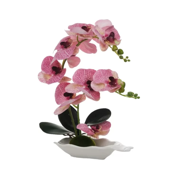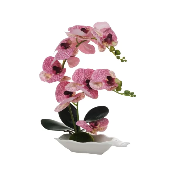 Orhideea decorativa artificiala in farfuriuta ceramica de 32 cm este un obiect de decor elegant si usor de intretinut. Orhideea artificiala are doua fire si este realizata cu mare atentie la detalii, astfel incat sa arate cat mai aproape de orhideea naturala. Farfuriuta din ceramica de culoare alba are un design placut, care completeaza perfect aspectul general al aranjamentului. Unul dintre avantajele majore ale utilizarii plantelor artificiale in orice decor este faptul ca acestea nu necesita ingrijire, spre deosebire de florile naturale. In plus, acestea sunt durabile intrucat sunt obtinute din PVC si isi pastreaza aspectul colorat si frumos timp indelungat. Orhideea decorativa artificiala in farfuriuta ceramica este una dintre cele mai bune optiuni celor care doresc sa adauge un strop de natura in propria casa sau birou, fara sa fie necesara udarea periodica.