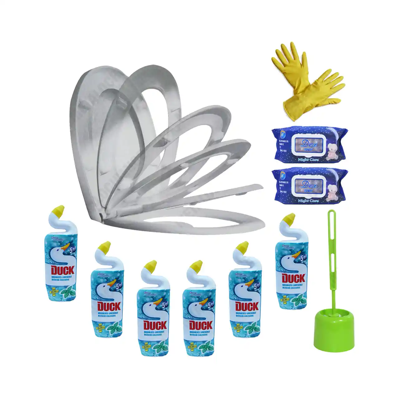 Pachetul cu 11 produse pentru igiena toaletei din baie cu dezinfectantul lichid Duck cu parfum marin, peria de toaleta cu peri tari de culoare verde, servetelele umede Dex Baby si capacul pentru WC cu sistem anti trantire (Soft Close). Peria de toaleta impreuna cu dezinfectantul lichid Duck veti curata riguros si veti parfuma in acelasi timp vasul de WC.
