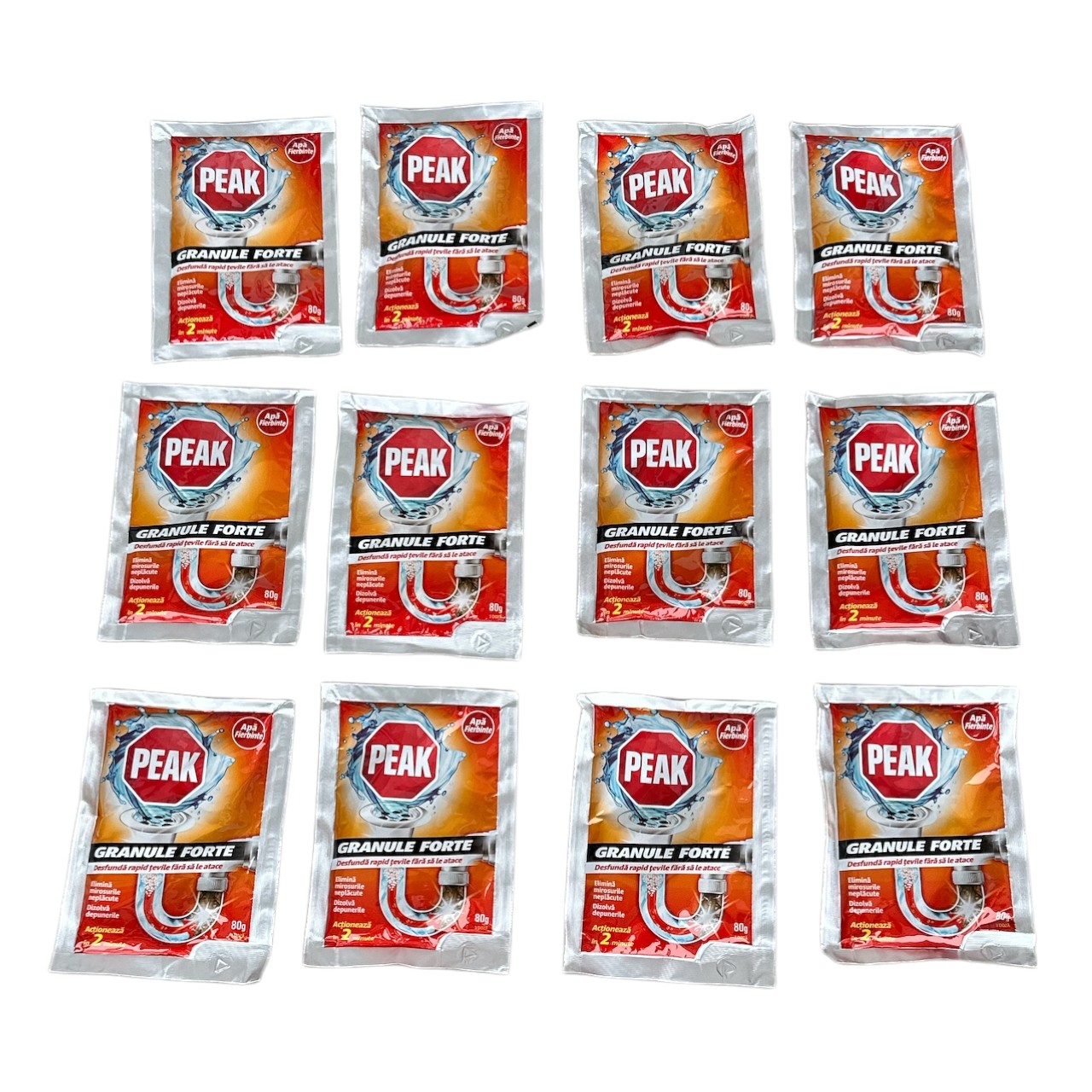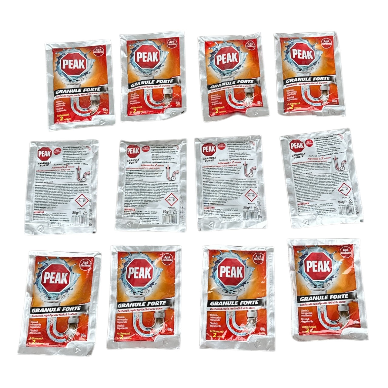 Peak Out granule forte este inamicul impotriva blocajelor de grasime, resturilor de mancare, sapun sau par depuse pe peretii tevilor de scurgere. Peak out dizolva dopurile de murdarie fara sa afecteze tevile sau sifoanele, fie ca sunt din plastic sau metal. Aceste granule au puterea de a desfunda usor si rapid orice tip de scurgere, eliminand si mirosurile neplacute.