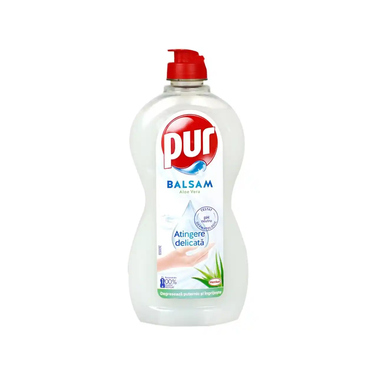 Pur detergent balsam pentru vase cu formula imbunatatita cu aloe vera inlatura grasimea si mancarea intarita sau arsa depusa pe vase si vesela, intr-un mod rapid si eficient. Detergentul de vase Pur este recomandat pentru spalarea manuala si cu doar 5 ml bucataria va straluci de curatenie. Datorita faptului ca are pH-ul neutru, aloe vera in compozitie, acest detergent de vase este recomandat si persoanelor cu pielea sensibila sau alergii, el fiind testat dermatologic.