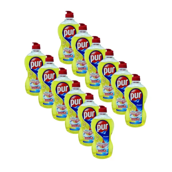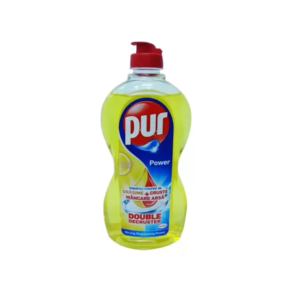 Cu cat mai multe Pur detergent de vase la 450 ml, cu atat mai multe vase curate si degresate. Datorita formulei sale active, detergentul pentru vase Pur Power elimina grasimea si resturile de mancare arsa de pe vesela sau vasele din bucatarie. Multumita puterii sale de actionare, Pur detergent vase inlatura mirosurile neplacute sau persistente si le improspateaza cu parfum puternic de lamaie. Cu 5ml de detergent Pur vasele vor straluci de curatenie.