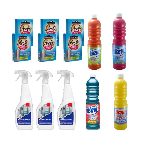 Cele 13 produse din pachetul ce cuprinde Asevi pardoseli, Solutie curatat frigider si Odorizant pentru frigider Arola Magic Cool va sunt de mare ajutor cand vine vorba de pardoseli curate, dezinfectate si parfumate, precum si de frigidere igienizate si fara mirosuri urate.