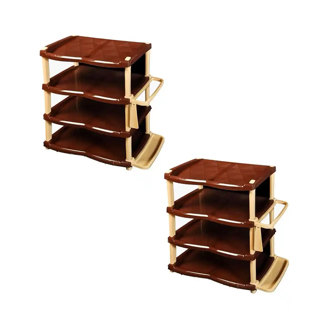 Pachetul cu 2 bucati de pantofar cu 4 etaje de culoare maro cu crem denumit si raft de pantofi sau incaltaminte asigura utilitate in orice camin intrucat va ofera posibilitatea sa organizati perechile de incaltaminte (pantofi, adidasi slapi, papuci sau ghete) in holul de la intrare. Pantofarul cu 4 etaje este prevazut si cu suport de umbrele, iar pe suprafate celor 4 polite se afla mici striatii pentru eliminarea alunecarii perechilor de incaltaminte. Intrucat are o greutate mica, acest pantofar poate fi mutat cu mare usurinta si aplicat in orice loc dorit.