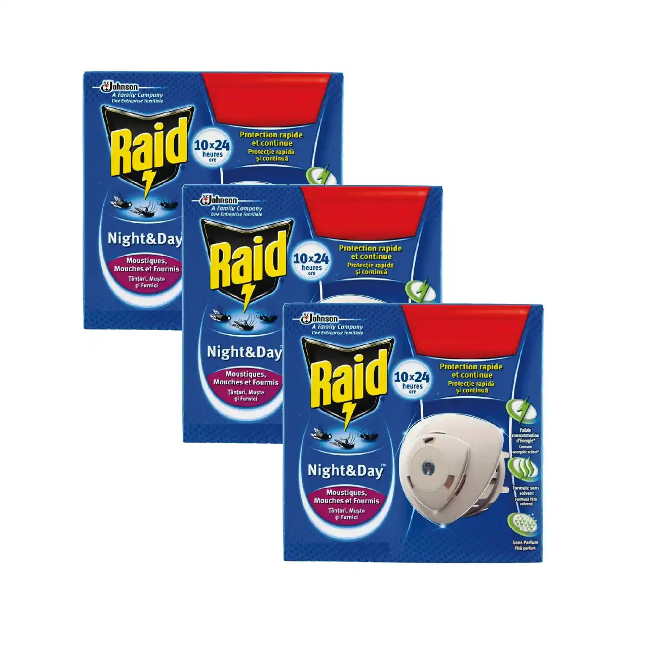 Pachet - 3 cutii cu 2 Raid, Aparat electric, Impotriva tantarilor si mustelor, Night&day + 1 rezerva