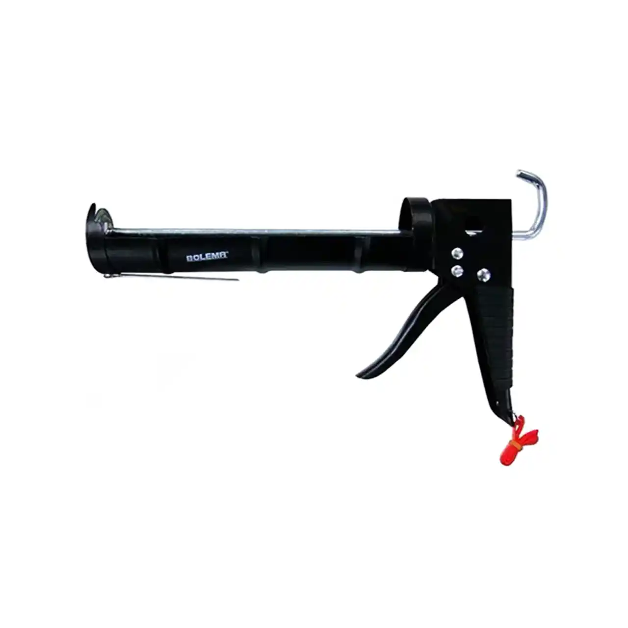 Pachetul cu 3 x Pistol pentru silicon din metal de culoare neagra sunt realizate din foaie de otel cu grosimea de 1 mm, protejate de vopsea anticoroziva de culoare neagra, iar manerul este unul ergonomic, semi-profesional. Aceste 3 pistoale pentru aplicarea siliconului au pe laterale orificii speciale ce permit taierea rapida a dopului aflat pe capul tubului cu silicon, astfel incat sa nu fie necesar sa aveti prea multe scule la indemana. Pistolul pentru silicon din metal negru este o unealta ce se actioneaza manual, asigurand o aplicare usoara, precisa si sigura in zone greu accesibile, in vederea izolarii sau etansarii diverselor obiecte sanitare. Sistemul de actionare al pistolului pentru silicon este unul prevazut cu o tija metalica care, in momentul actionarii manerului impinge baza tubului ce forteaza siliconul sa iasa.