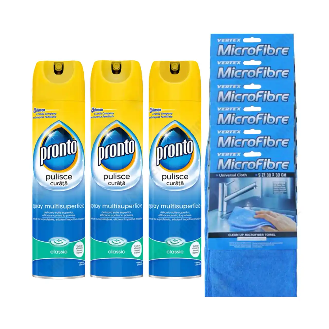 Pachet 3 x Spray Pronto multisuprafete 300 ml + 6 x Laveta microfibre 30x30 cm