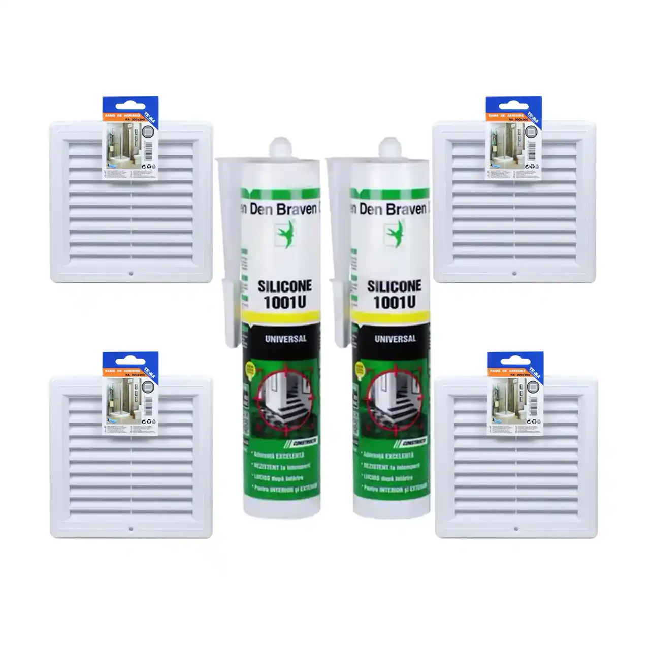 Pachet 4 x Rama de aerisire cu plasa 20x20cm + 2 x Silicon transparent universal 1001U 280ml