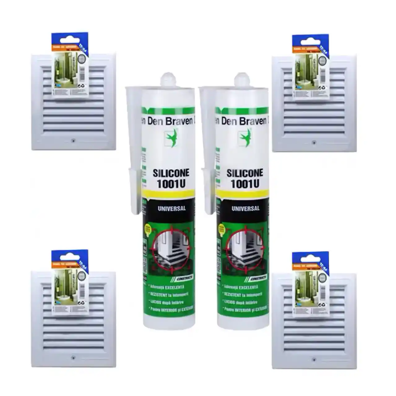 Pachet 4 x Rama de aerisire 150 x 200 mm + 2 x Den Braven Silicon universal transparent 1001U, 280 ml
