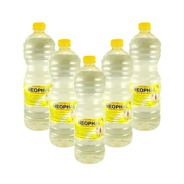 Pachetul cu 5 bucati de neofalina - Neophal la sticla de 1 litru a fost conceput in mod special pentru curatarea suprafetelor mari acoperite cu lemn (parchet), material textil sau pentru curatarea industriala a mecanismelor fine precum cele din interiorul ceasurilor. Neofalina se distinge prin capacitatea de a elimina grasimea uleiul uscat sau murdaria si are un mirosul specific si puternic intepator. Aplicarea solutiei se poate face cu ajutorul unui tampon sau sticla cu cap pulverizator. Solutia este inflamabila si trebuie ferita de indemanarea copiilor.