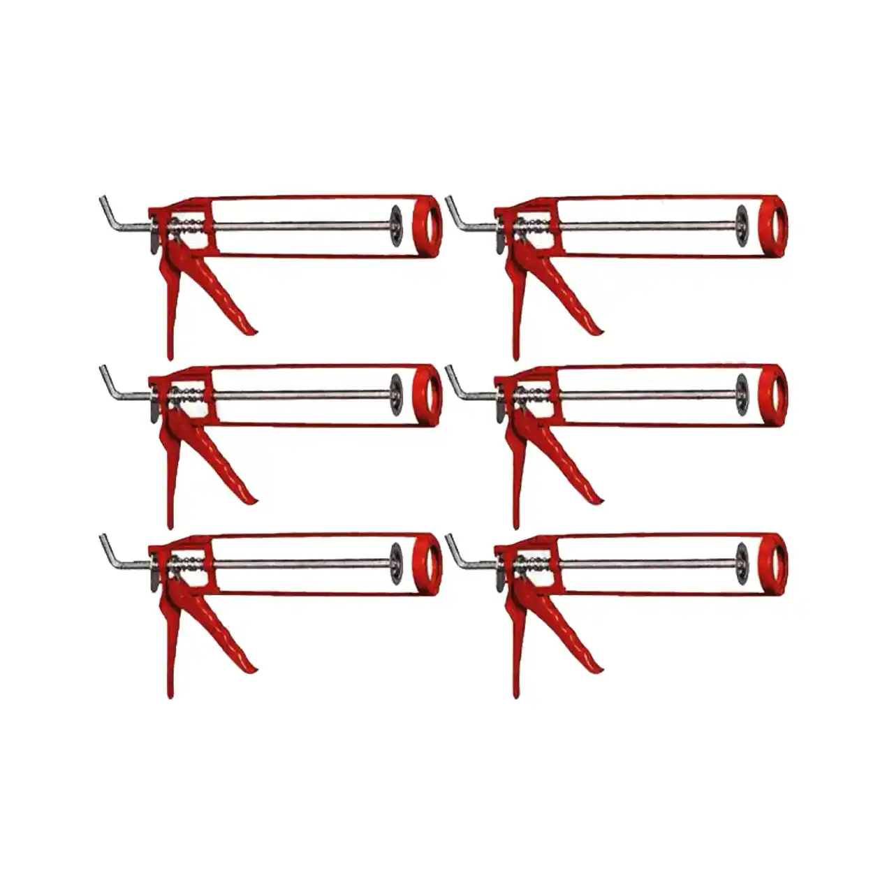 Pachetul cu 6 x pistol pentru tub de silicon de culoare portocaliu este un produs format dintr-o structura metalica dura ce rezista cu succes loviturilor repetate si este vopsit cu vopsea speciala ce fereste metalul de rugina sau alti factori ce pot crea coroziune. Pachetul ce are in continutul sau 6 pistoale pentru tub de silicon va usura munca oricarui profesionist ce etanseaza diferite obiecte sanitare, cum ar fi: lavoarul, cada, cabina de dus, chiuveta, bideul etc. Pistolul portocaliu pentru tub de silicon este prevazut cu maner de actionare si o tija metalica care este impinsa in interiorul tubului de silicon in momentul in care apasati pe maner, fortand in acest fel siliconul sa iasa din tub.