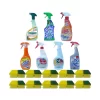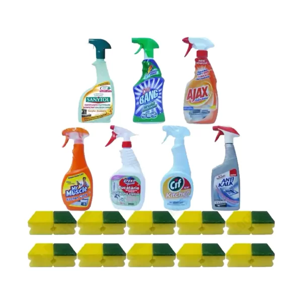 Pachetul cu 7 solutii de curatat bucataria este esential pentru eliminarea oricarui tip de murdarie din bucatarie, cum ar fi: calcar, praf, ulei, grasime, etc. In acest pachet cu solutii de bucatarie veti regasi si 10 seturi de bureti de vase prevazuti cu o parte abraziva, pentru a va ajuta in procesul de curatare / spalare.