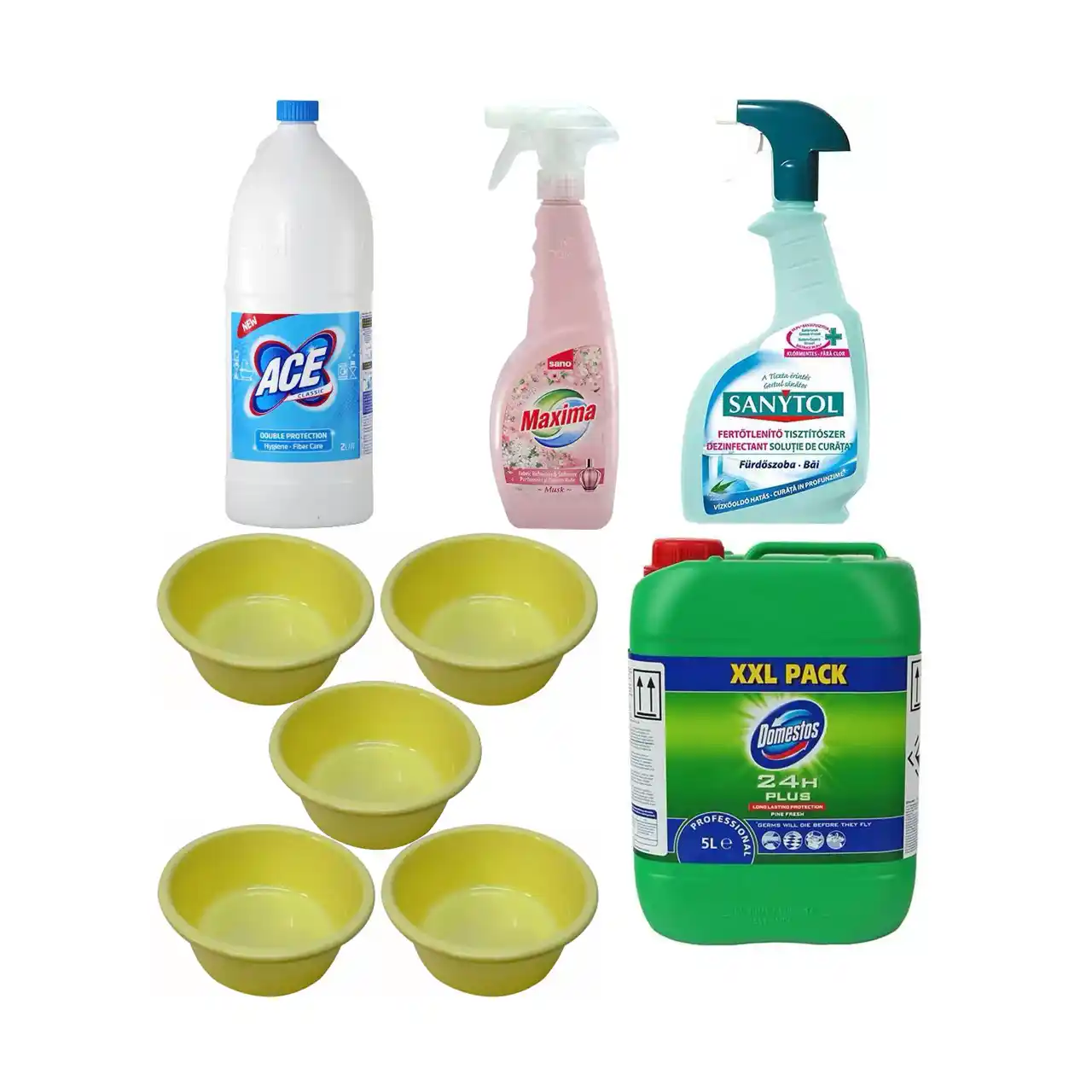 Pachet - 5 x Lighean plastic rotund 4L + Domestos 5 L + Odorizant haine + Ace Classic + Sanytol baie