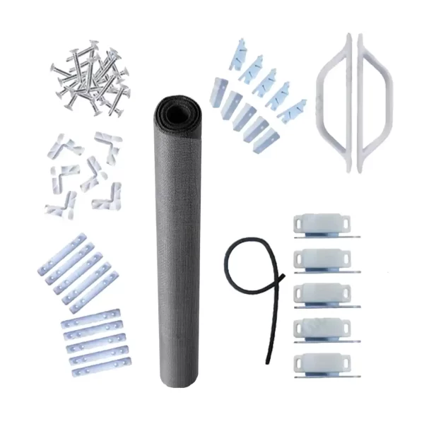 Pachet Accesorii Plase insecte (ALB) - 2 x Maner D pentru usa, din plastic, Alb, 5 x Magnet pentru profil, Alb, 20 x Coltar + 10 x Balama + 5 x Snaper + 5 x Maner + 70 Autoforant + 30m Garnitura + 7m Plasa insecte (Latime: 1m)