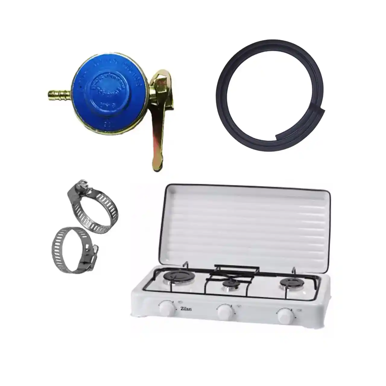 Pachetul cu aragaz 3 ochiuri Zilan de culoare alba, 2m furtun gaz, 2 coliere si 1 ceas de butelie este recomandat pentru plecarile in aer liber, la picnic, cu cortul sau rulota. Mai aveti nevoie doar de o masa si o butelie si iesirile in natura vor fi unele reusite. Aragazul cu 3 ochiuri de la Zilan functioneaza alimentat doar la butelie si nu se racordeaza lui la reteaua de gaze naturale, intrucat nu este construit sa reziste presiunii mari.
