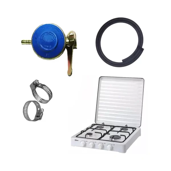 Pachet - Aragaz Zilan 4 ochiuri Alb + 2m furtun gaz + 2 x Coliere + Ceas butelie