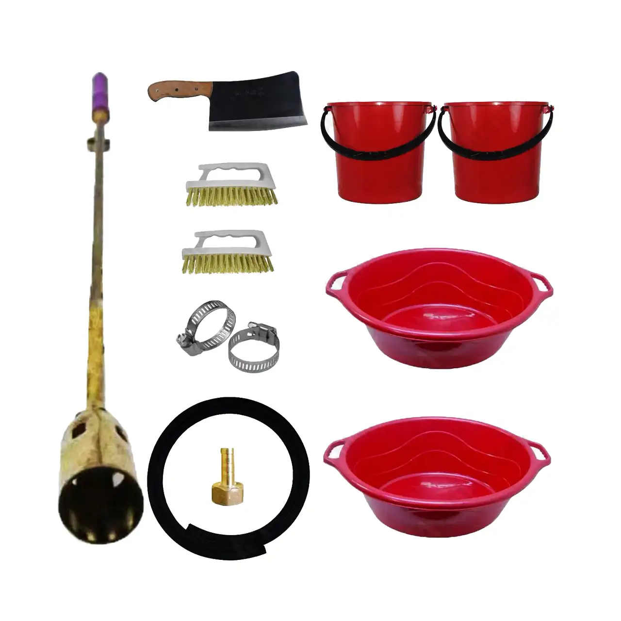 Pachetul cu accesorii pentru parlirea si transarea porculul, cuprinde minimul necesar pentru parlire, curatare si depozitare a bucatilor de carne transata dupa taierea porcului.