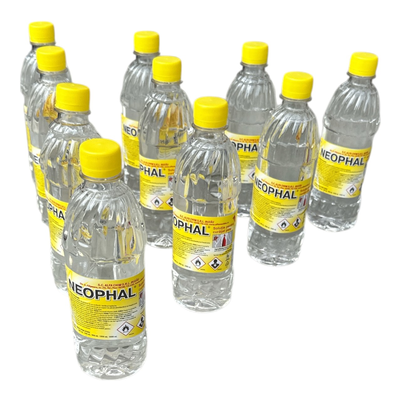 Pachetul cu neofalina (Neophal) la 500 ml in cantitate de 10 bucati este o solutie incolora cu miros puternic, utila pentru eliminarea celor mai dificile pete de ulei, grasime si murdarie atat de pe suprafetele lemnoase cat si de pe materialele textile. Solutia mai este des folosita si pentru curatarea ceasurilor sau altor mecanisme fine. Neofalina este defapt o benzina de extractie obtinuta din distilatea titeiului in amestec cu benzen, foarte periculoasa in cazul in care este lasata nesupravegheata. Utilizarea solutiei Neophal (neofalina) poate fi facuta atat prin pulverizare cat si prin tamponare cu o panza absorbanta.