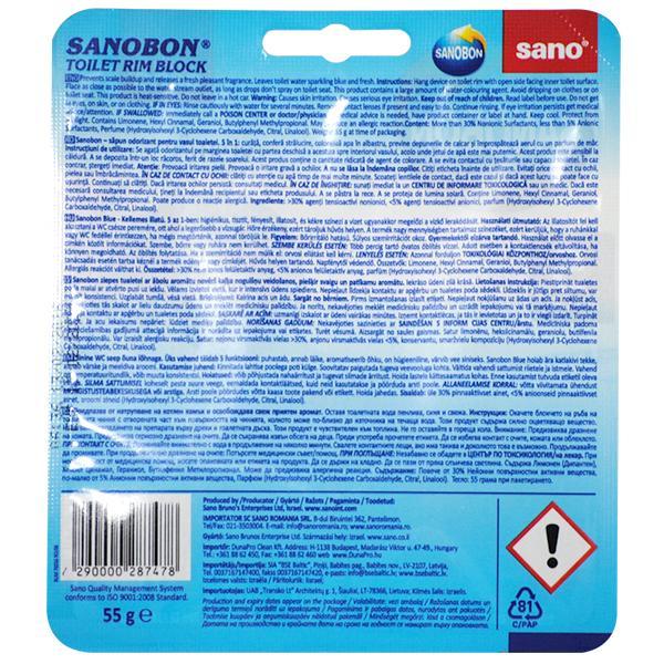 SanoBon este un sapun odorizant pentru vasul toaletei 5 in 1: curata, confera stralucire, coloreaza apa in albastru, previne depunerile de calcar si improspateaza aerul cu un parfum de mar. A se depozita intr-un loc racoros, ferit de razele soarelui. Acest produs este sensibil la caldura. Acest produs contine o cantitate ridicata de agent de colorare. A se evita contactul cu tesaturile sau capacul toaletei. In caz contrar, stergeti imediat. ATENTIE: A nu se lasa la indemana copiilor!