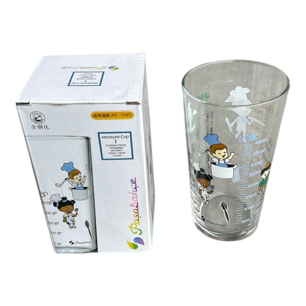 Paharul din sticla, gradat pentru copii cu capacitatea de 400 ml este realizat din sticla transparenta in forma conica cu baza mica si gura larga, iar exteriorul este placut decorat (pe langa gradatiile evidente) cu copii bucatari in multiple culori. Acesta a fost gantit pentru asigurarerea unei cantitati exacte de cat lapte sa bea copilul sau orice alt tip de amestec (suc de fructe si legume) etc. In plus, gradatiile care incept de la 50 ml pana la 400 ml (cu indicatii din 50 in 50 ml) va ajuta sa dozati corespunzator ingredientele lichide atunci cand preparati o mancare sau o prajutura pentru cel mic.