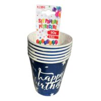 Paharele biodegradabile Happy Birthday, cu o capacitate de 250 ml, vin intr-un set de 6 bucati, sunt realizate din carton impermeabil 100% biodegradabil, oferind o solutie perfecta pentru petrecerile si evenimentele onomastice. Designul lor atragator colorat ce include si inscriptia "Happy Birthday" (La multi ani), va fi in ton cu petrecerea. Cartonul biodegradabil din care sunt confectionate asigura o descompunere in mod natural dupa utilizare. Paharele din carton biodegradabil sunt potrivite pentru servirea sucurilor naturale, bauturilor cu alcool, cocktailurilor si nu numai. In plus, chiar daca suntbiodegradabile, acestea nu se for deteriora / rufe usor, avand aceeasi rezistenta ca orice alt pahar normal din carton.